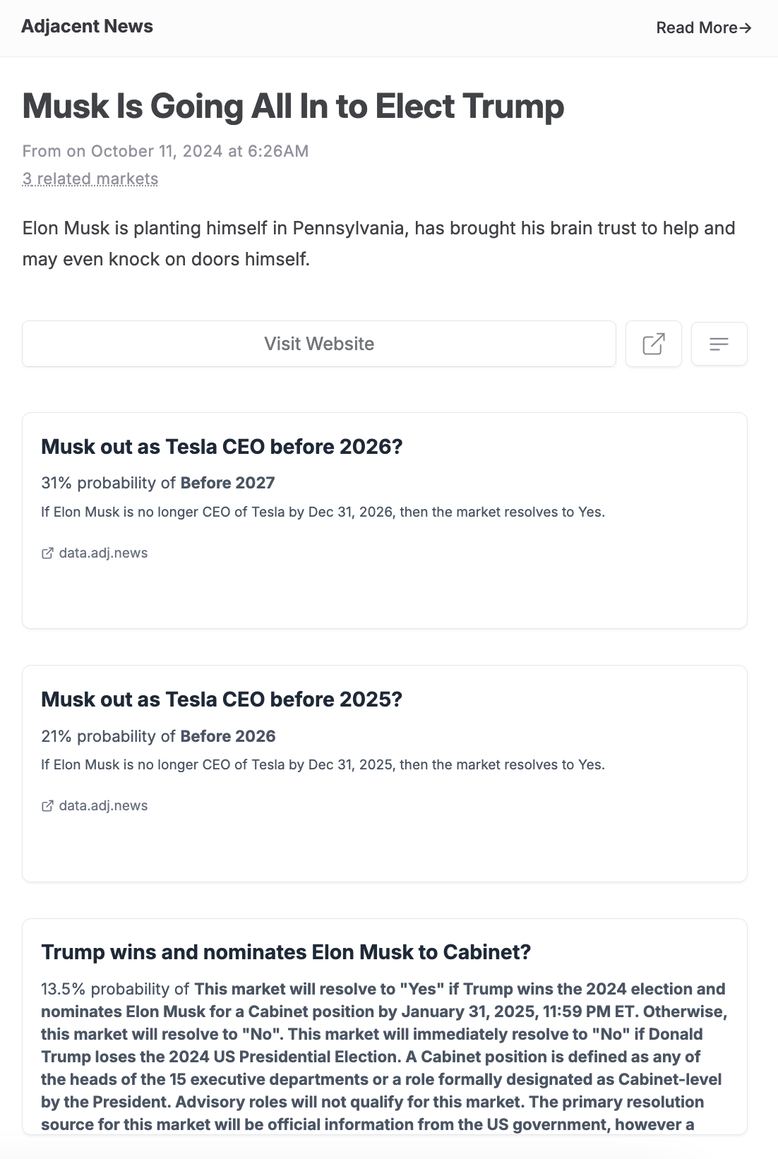 Published News - articles that we produce and distribute, this is mostly through generation of content based on shifts in odds across various markets but also features original content from various writers and forecasters. Content is distributed via Adjacent News, RSS, X / Twitter, and via a Telegram Channel