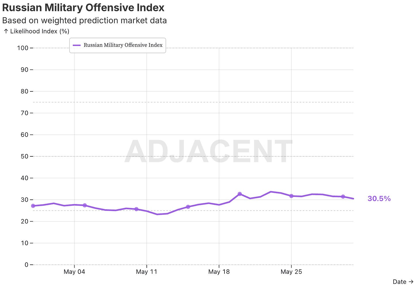 Weighted 30.5% chance of Russian advances. But what does it mean exactly? Considering that the index weighs chances of Russia capturing several frontline cities in 2025, this basically means that there is overall 30.5% chance that Russia will “significantly” push the front westward. Not that significantly as the index doesn’t include main cities like Kherson, Kharkiv or Zaporizhzhia which are further westward.