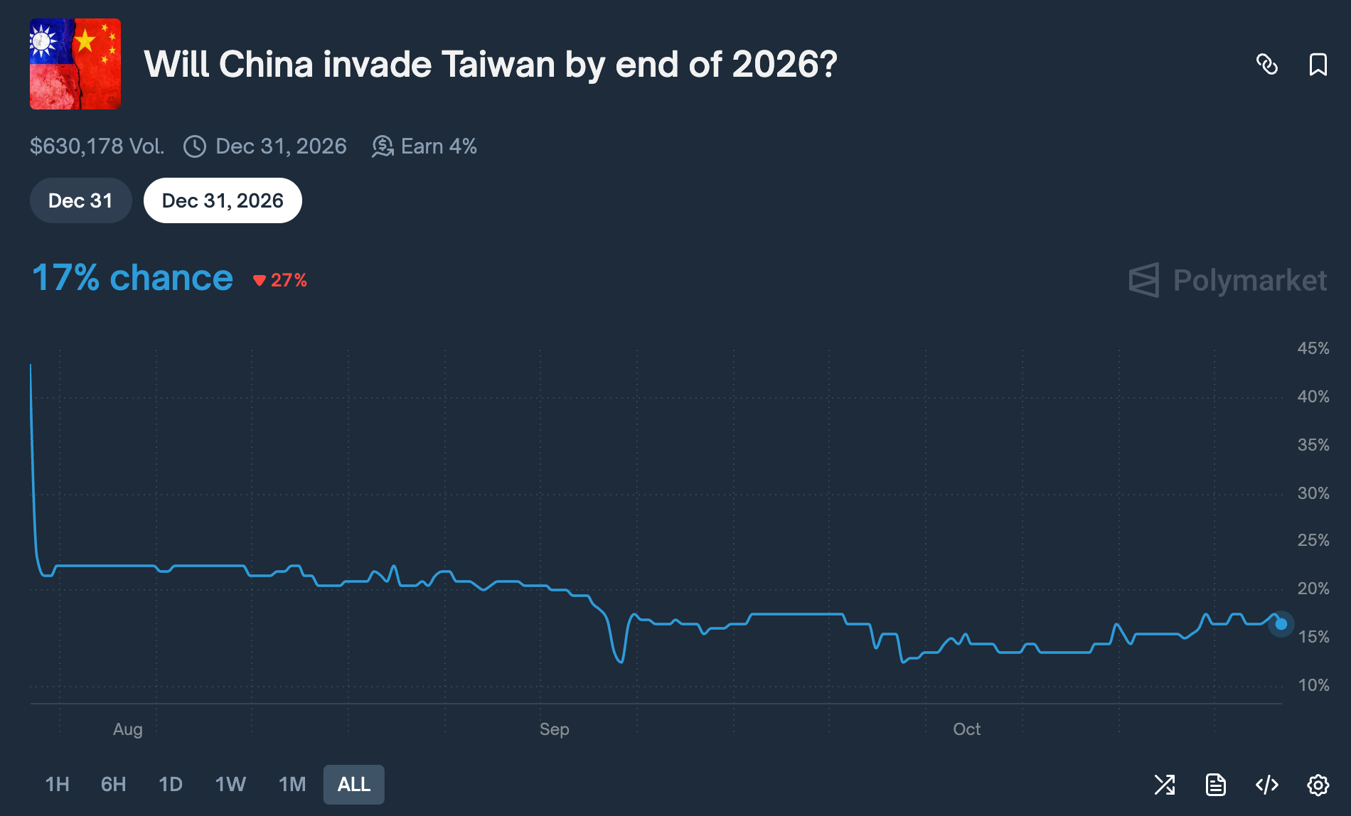 As the proxy wars around the world might heat up, I see less chance of a direct confrontation in Taiwan. The US is moving the chip production outside of the island, to the US. Internally, the party that is more aligned with China is gaining popularity. And it might just be that Taiwan will be slowly integrated into China, but no longer as a vital point in a bloody war, but as an afterthought, with no blood shed. I might be a buyer on the No side here if I see any spikes: